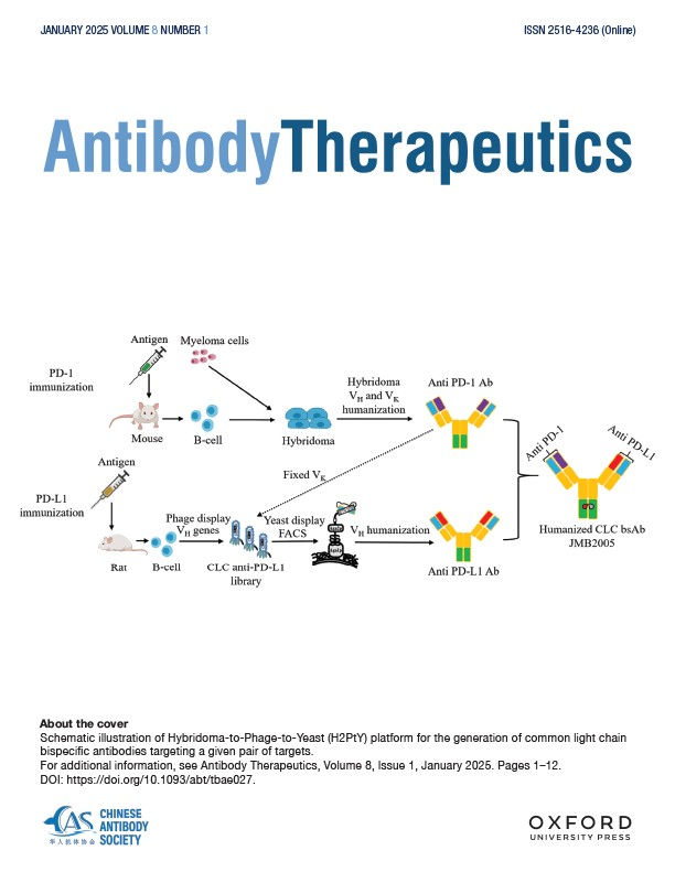 Antibody Therapeutics is the official journal of ChAbS, published by Oxford University Press. As an international peer-reviewed open access journal, Antibody Therapeutics provides a forum for the publication of the latest advances and challenges in the discovery, research, development, manufacturing, and methodology of therapeutic antibodies for the global scientific community. Antibody Therapeutics is indexed by ESCI, PubMed and Scopus with a CiteScore™ (Scopus) of 8.4, a first Impact Factor of 4.5 (Journal Citation Reports™), and over 175,000 full-text downloads in 2024.